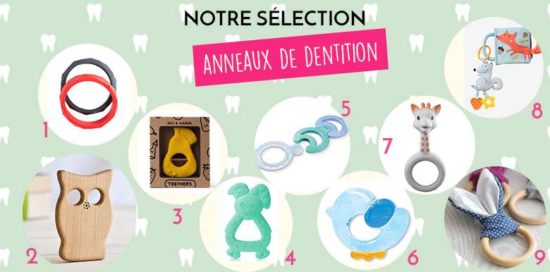 Vous avez remarqué que les gencives de bébé commençaient à se modifier, il bave plus, s'énerve sur son poing, c'est sans doute le signe qu'il prépare ses dents. Pour l'aider vous pouvez vous procurer un ou plusieurs anneaux de dentition. Voici une sélection de ce que vous pourrez trouver sur le net, il y en a pour tous les goûts!